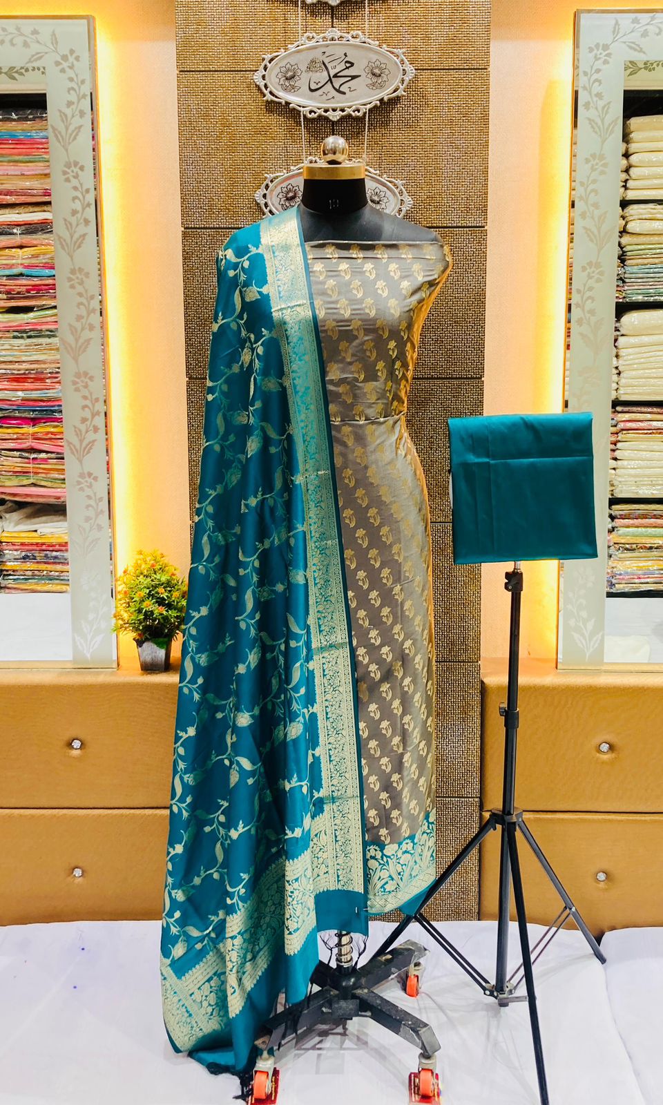 This Banarasi Katan silk Zari weaving suit is the epitome of luxury and elegance. Made of very soft silk, it features a beautiful Alfi Dupatta and a plain silk bottom, each measuring approximately 2.5 mtrs. Its rich color may vary slightly due to lighting and photographic effects, adding to its unique charm.