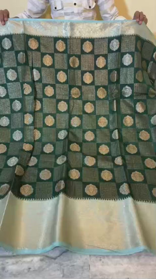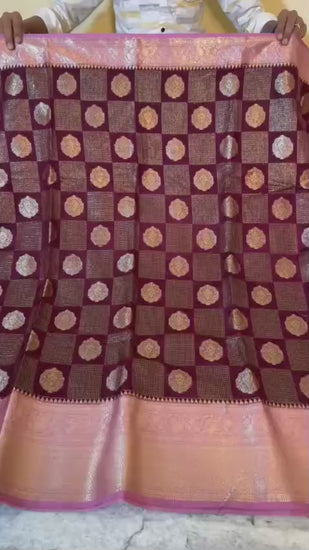 Experience elegance with Banarasi semi katan silk sarees featuring a contemporary chokdi design. Crafted from new trending semi katan silk, this saree showcases an ornate big border and a brocaded contrast blouse piece. The jacquard weaving on the contrast pallu adds a sophisticated touch, available in single and multiple options for versatility.