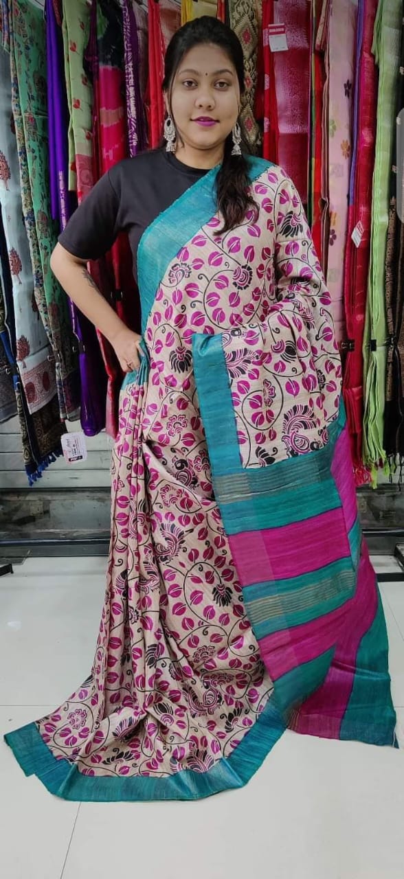 Pure Tussar gicha screen print sarees with running blouse. Silk Mark Certified.