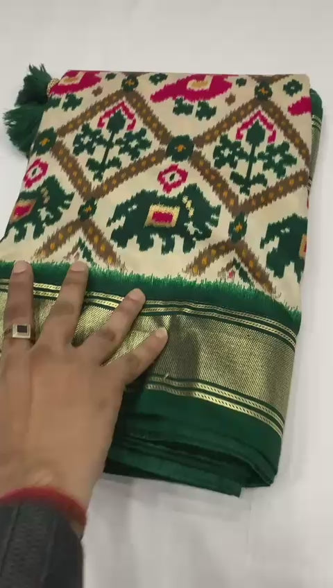 Introducing our new exclusive collection -Munga crepe patola silk sarees. Made with allover foil Ikkat Patola prints and a beautiful ikkath foil printed pallu with tassels, these sarees are a must-have for any special occasion. The contrast printed Ikat blouse adds a touch of elegance. Only a limited number available, so book your order now. Trust in our quality.
