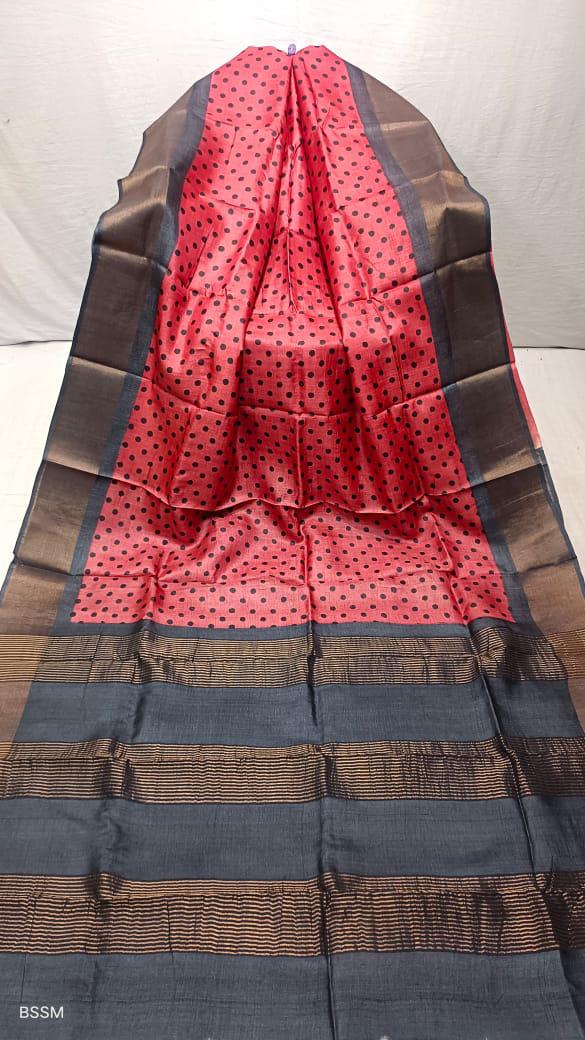 Expertly crafted with the finest pure tussar silk, our pink sarees are screen and block printed for a unique and elegant look. These sarees come with a running blouse, making them a versatile and convenient addition to any wardrobe. Elevate your style with our luxurious silk sarees.