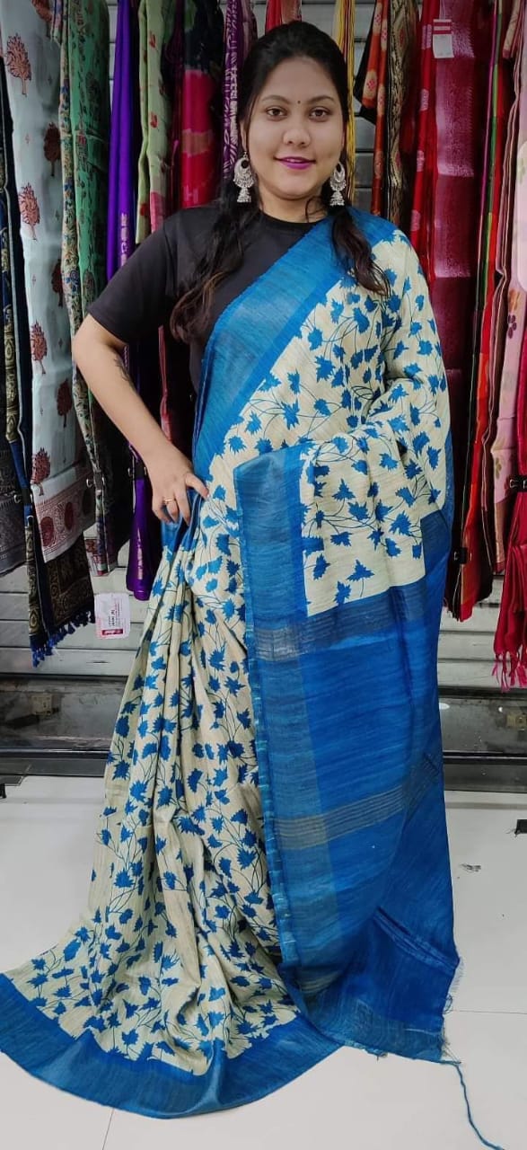 Cream and sky blue Pure Tussar gicha screen print sarees