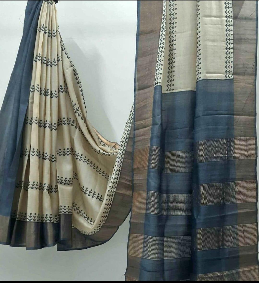 Block printed pure desi tussar silk handloom saree with blouse ,silk mark Certified.