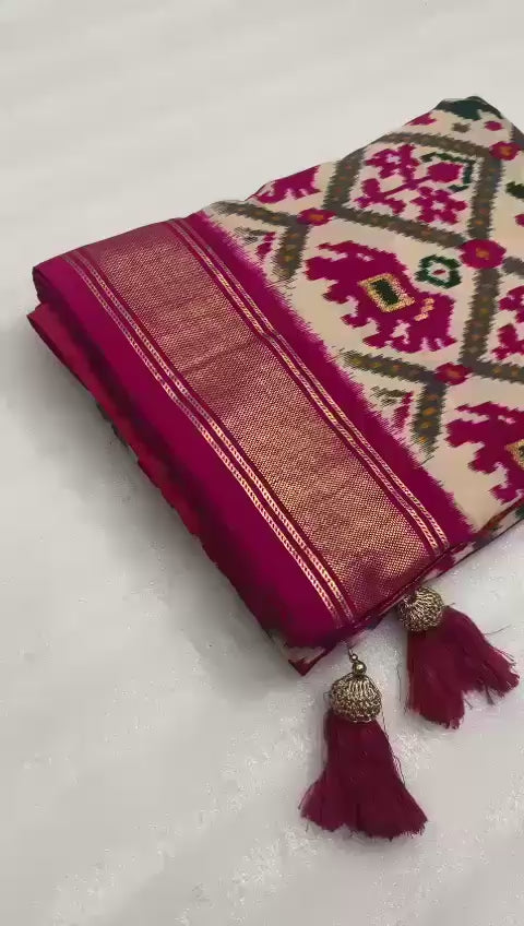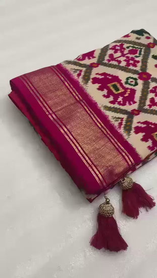 Cream with pink munga crepe patola silk sarees