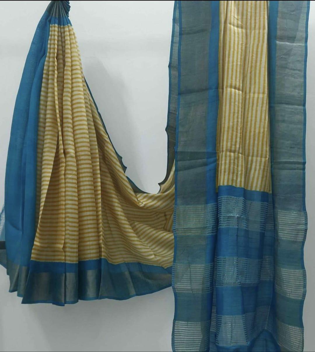 Creamy yellow block print tussar silk sarees