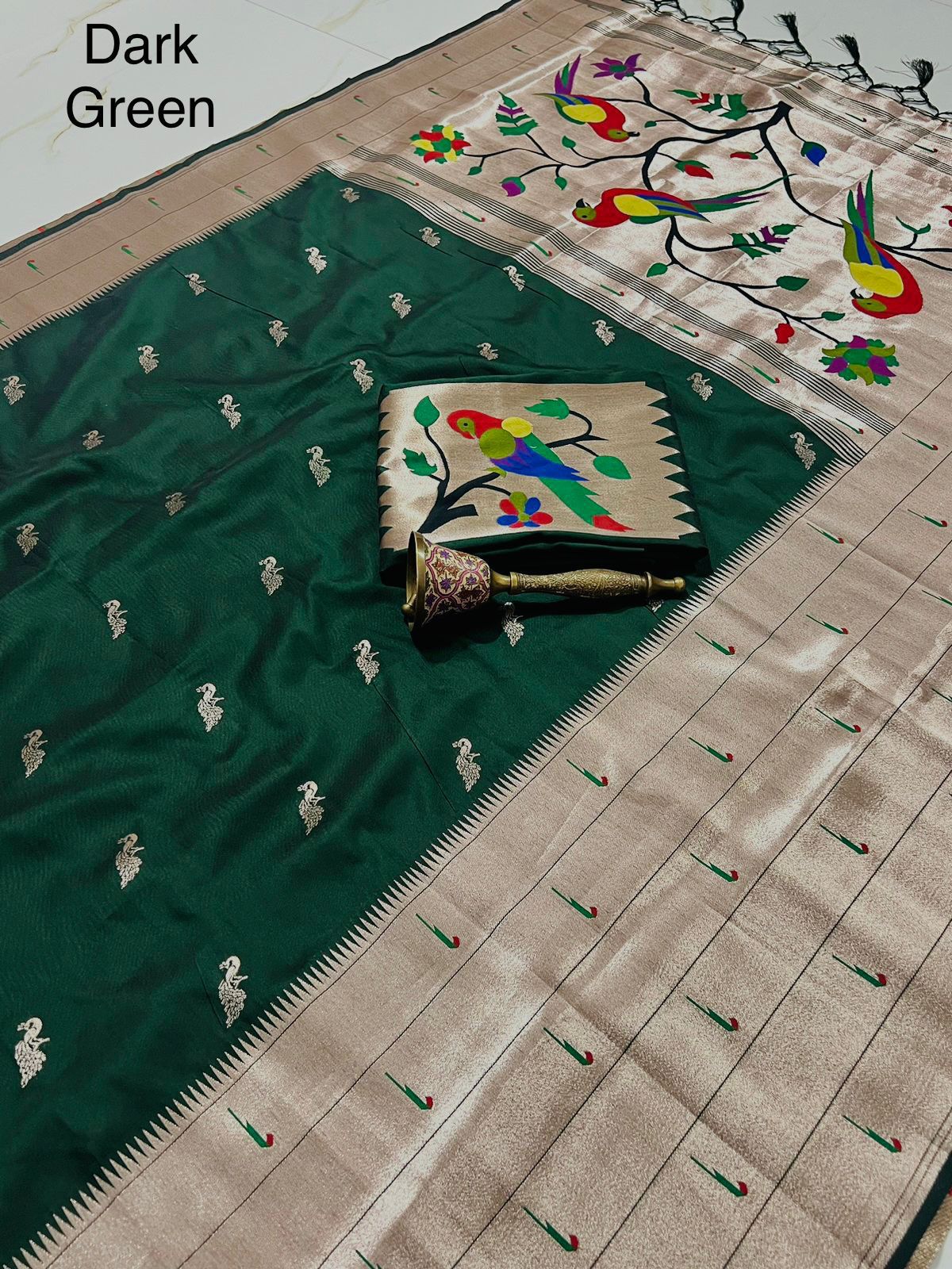 Experience luxury and grace with dark green kanjivaram paithani silk sarees. Made from pure soft Kanchivram silk, these sarees feature stunning parrot designs in original zari, and a bold Muniya border with intricate mina zari weaving. Comes with a BROCKET blouse for a complete look. 100% authentic and of the highest quality.