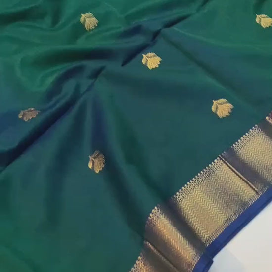 Discover the elegant beauty of our Dual tone green Maheshwari silk sarees. Handloom lotus 🪷 butta design in soft silk by cotton material.