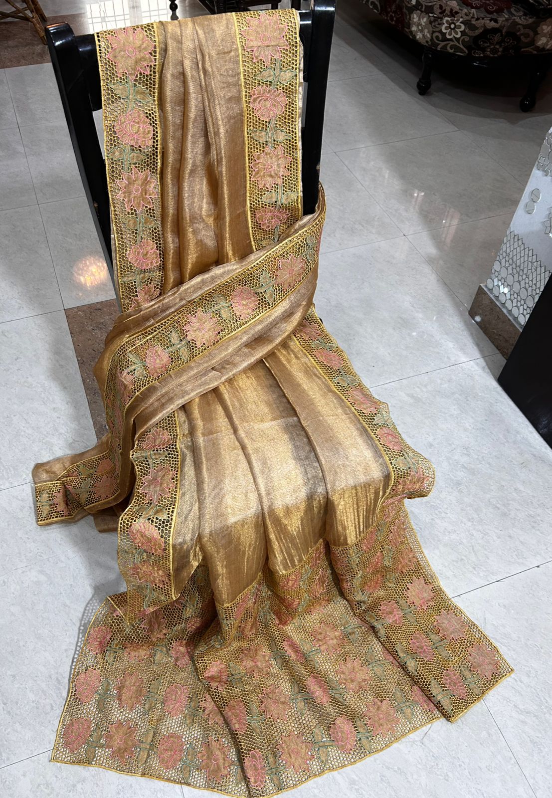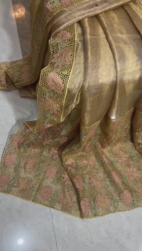 Cut work pure tussar tissue silk saree with running blouse. Silk Mark Certified.
