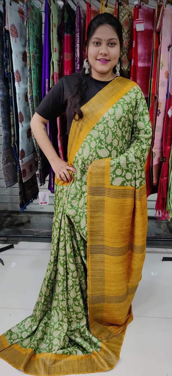 Green and yellow Pure Tussar gicha screen print sarees