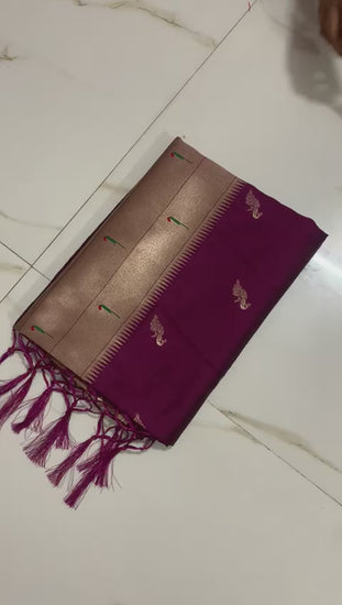 Experience luxury and grace with maroon kanjivaram paithani silk sarees. Made from pure soft Kanchivram silk, these sarees feature stunning parrot designs in original zari, and a bold Muniya border with intricate mina zari weaving. Comes with a BROCKET blouse for a complete look. 100% authentic and of the highest quality.