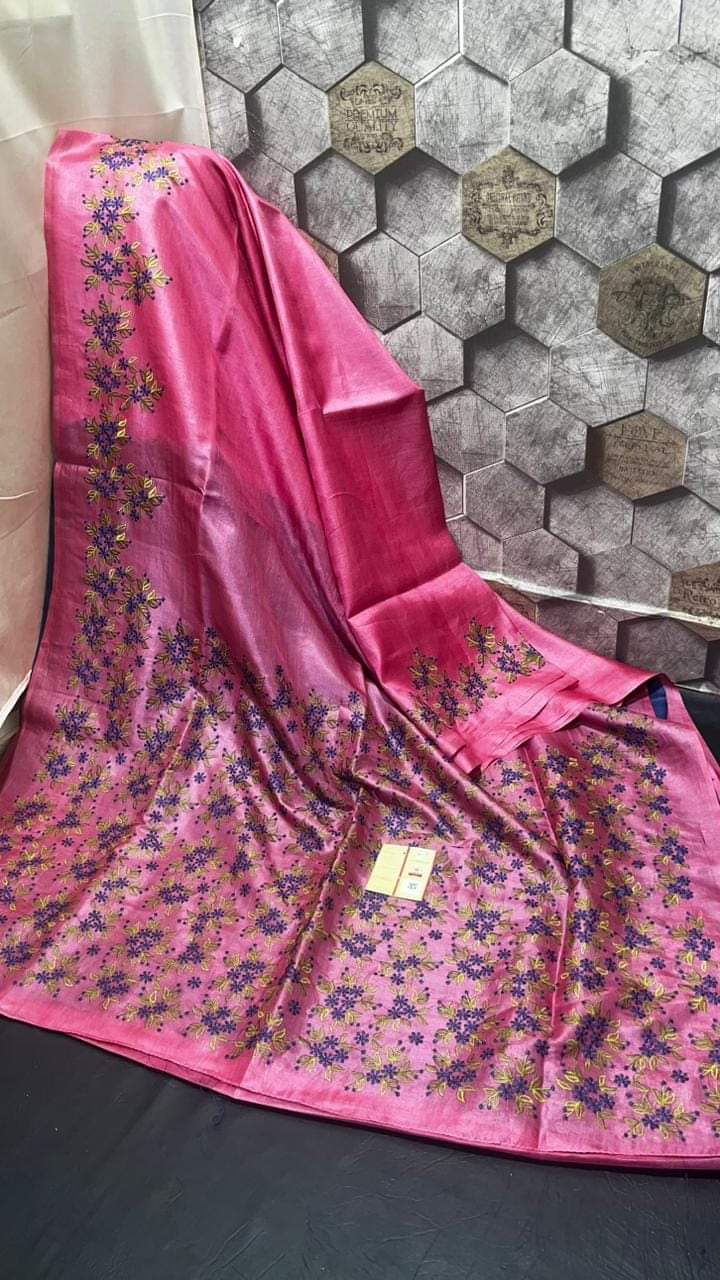 Pink pure tussar silk embroidery sarees