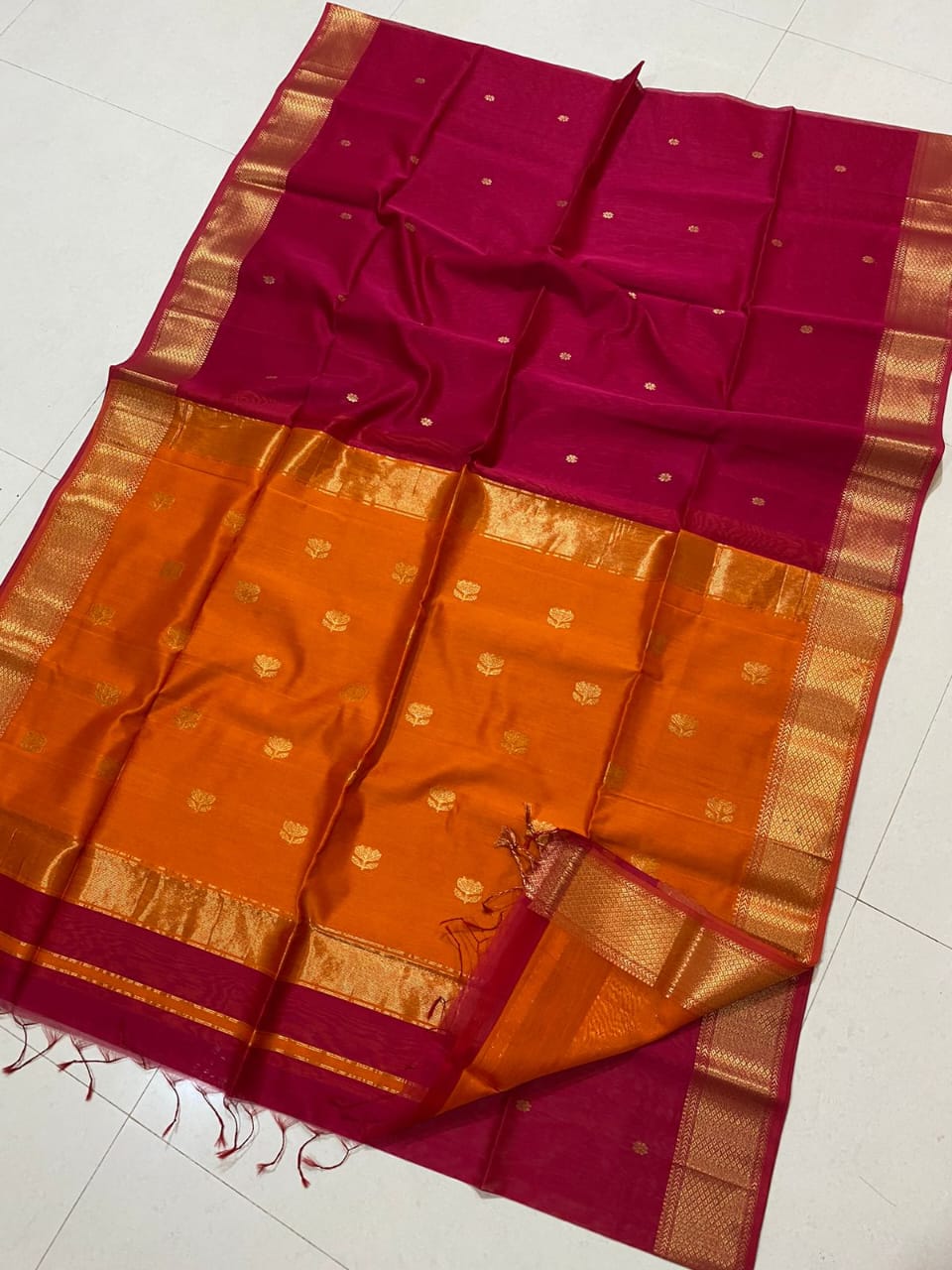 Maheshwari handloom golden jari border and Lotus butta in pallu with running blouse.
