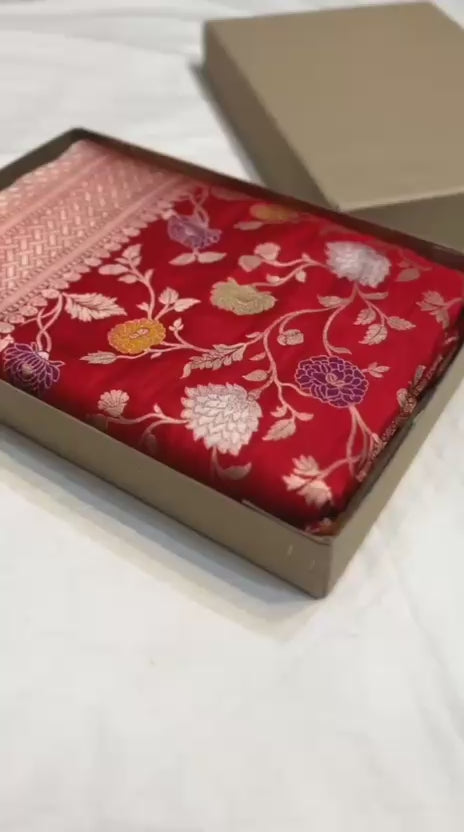 This stunning banarasi handloom pure katan silk saree features a beautiful rose design and intricate meenakari weaving. Made with golden zari weave, this saree is perfect for weddings and parties. With Silkmark verification, it is a high-quality piece ready to dispatch.