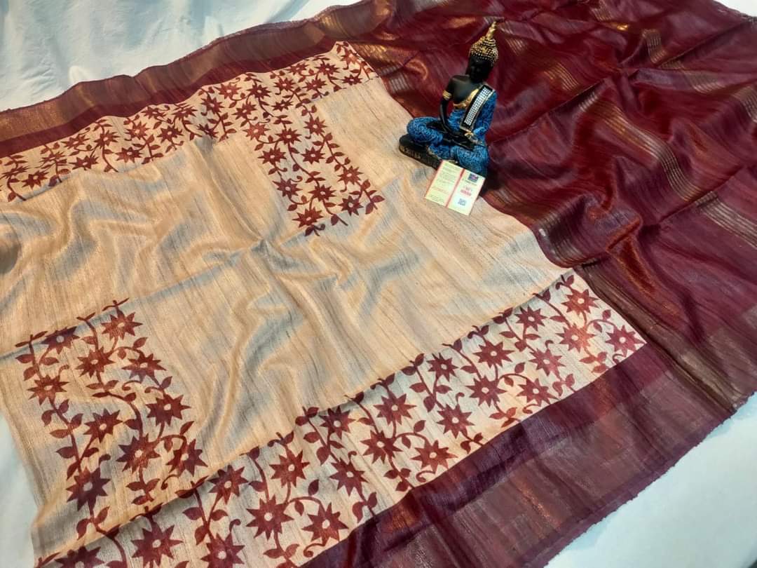 Sandal and maroon Pure Tussar gicha screen print sarees